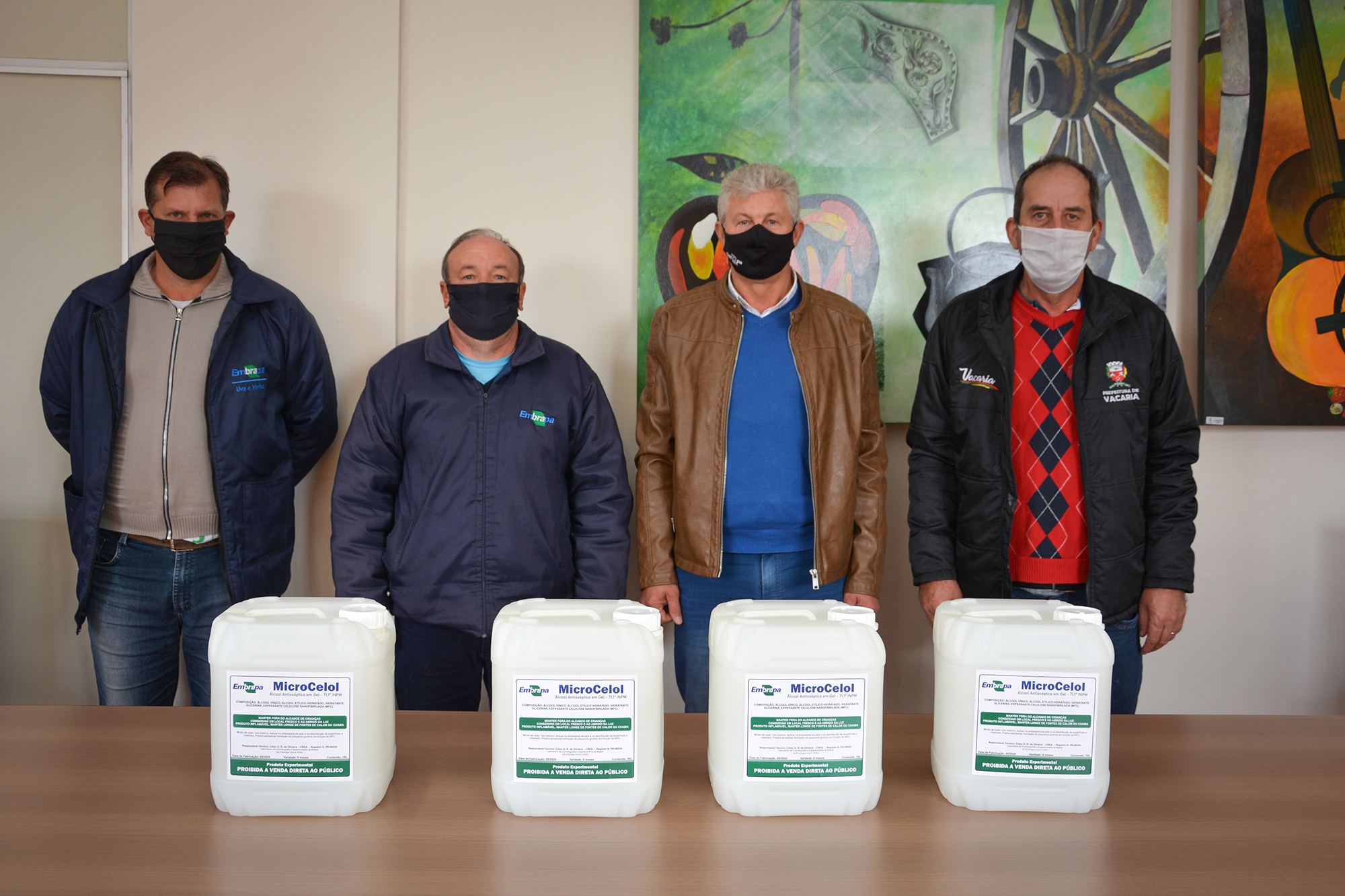 Na manhã desta terça-feira, dia 02 de junho, a Embrapa Uva e Vinho repassou à Prefeitura Municipal de Vacaria 40 litros de álcool gel para ser utilizado nas ações de prevenção ao COVID-19 no município.