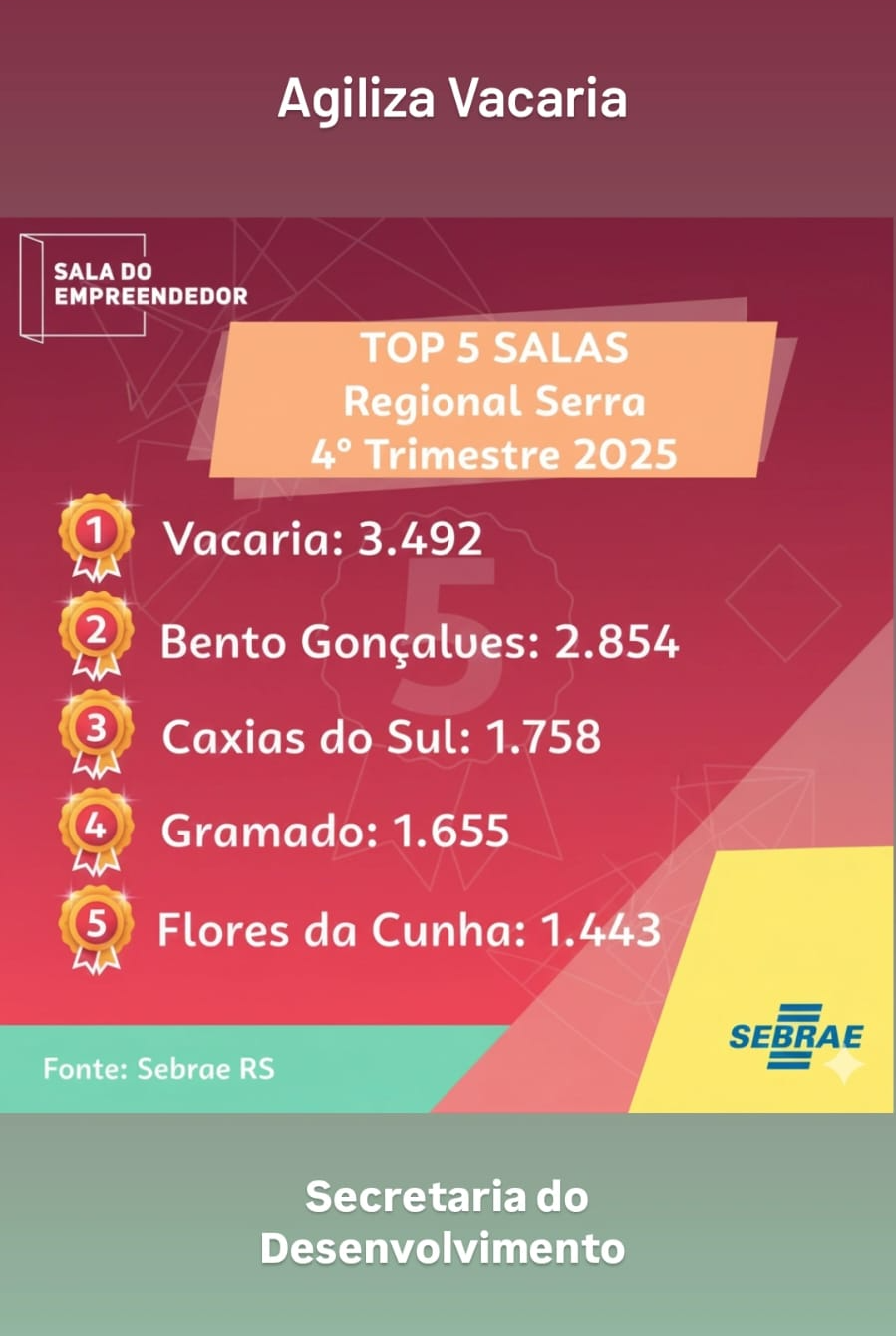 Com o fechamento do quarto trimestre do ano passado o município de Vacaria foi confirmado como o líder na prestação de serviços em todo o ano passado, sendo o primeiro lugar em todos os trimestres. Destaque para o terceiro trimestre quando na Sala do Empreendedor foram atendidas 3.935 pessoas. Ao longo dos 12 meses de 2025 passaram pela Sala do Empreendedor, dentro do projeto Agiliza Vacaria 14.986 empreendedores de todos os portes.