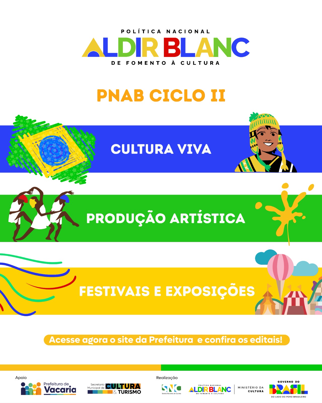 A Prefeitura de Vacaria, por meio da Secretaria Municipal de Cultura e Turismo, lançou os editais do PNAB Ciclo II (Política Nacional Aldir Blanc de Fomento à Cultura), ampliando as oportunidades de incentivo a artistas, produtores culturais e iniciativas locais. A ação integra a política nacional de fortalecimento do setor cultural e busca valorizar a diversidade de expressões presentes no município, ao mesmo tempo em que amplia o acesso a recursos públicos e estimula a produção cultural em diferentes segmentos.